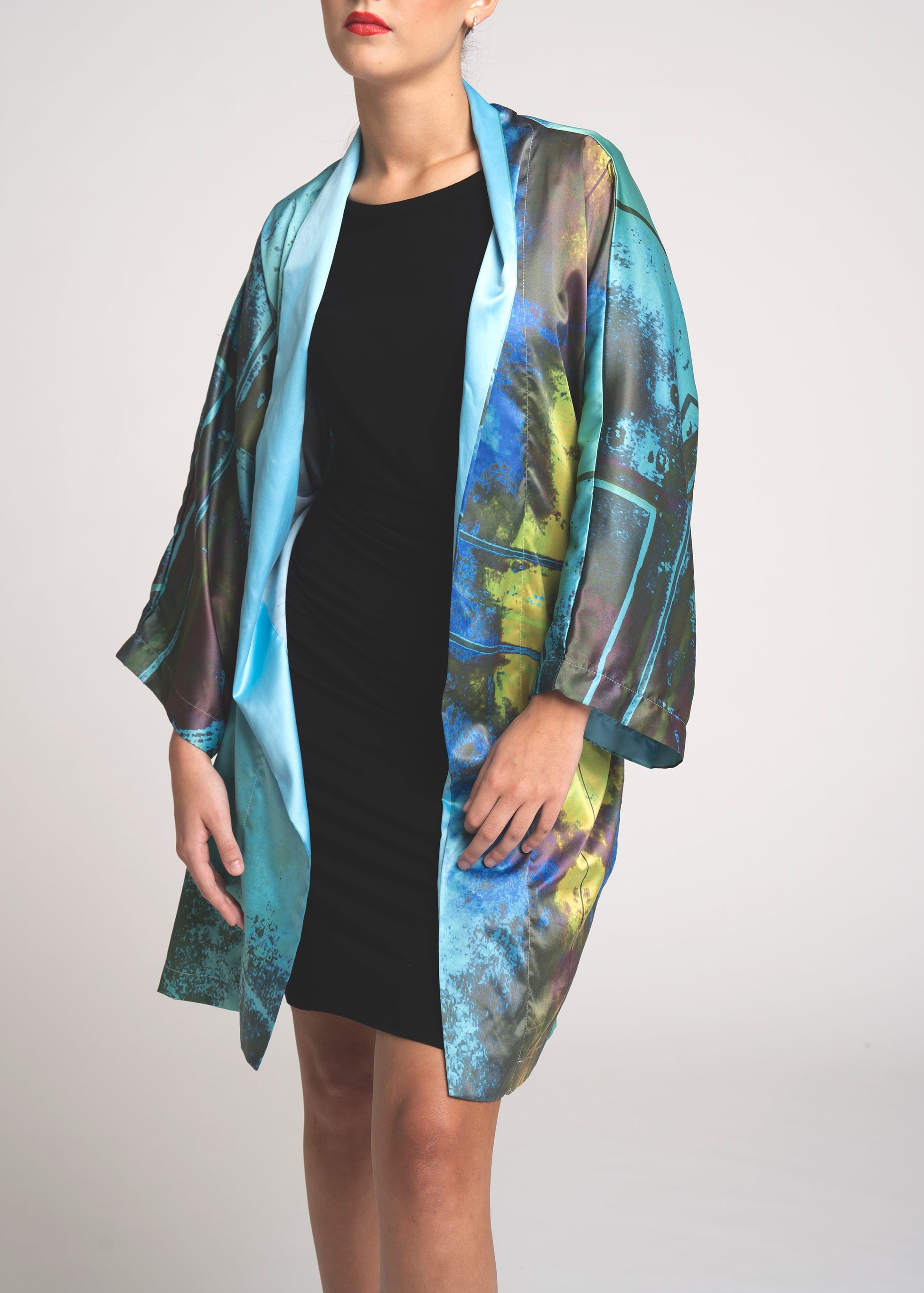 - kimono is cut in the traditional Japanese kimono shape, with wide, three-quarter length sleeves. The Kimono should fit loosely, with the square collar turned up or down.