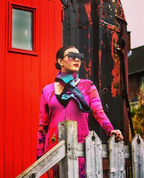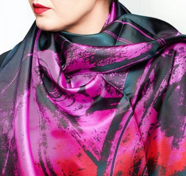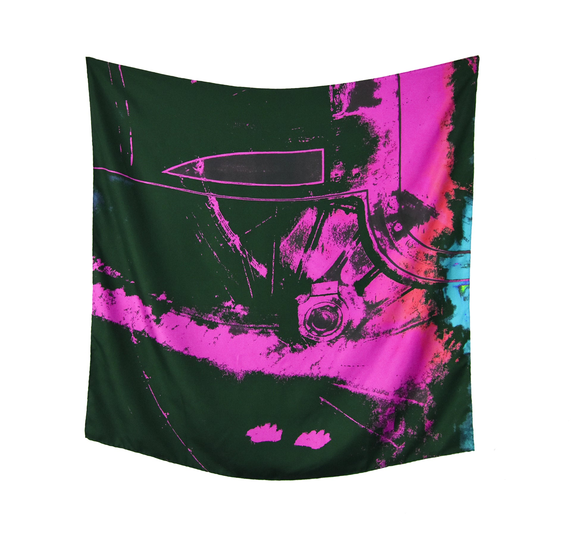 An over sized silk satin square scarf, in grey, hot pink, and turquoise,  wearable art,  in  the steam train wheel print series. Inspired by paintings and drawings of a vintage steam train engine wheel,  taken from one of N.Ireland's oldest trains, from a heritage site of transport and culture. Taking something mundane and giving it a fresh vibrancy through colour and shape. A true work of art. Can be worn as a head scarf, belt, ankle sash, and one off the shoulder top. Extremely versatile and wearable. Can be folded an worn in different ways to showcase various colour ways, which will go with a multitude of outfits.